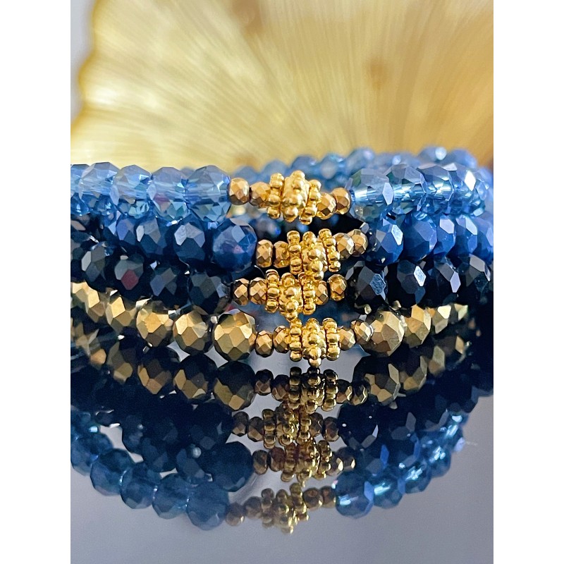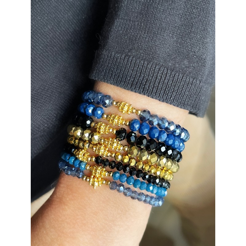 Composés de perles facettées en cristal sublimées par des perles dorées à l’or fin 24 ct et d’hématites, les bracelets SIMONES & JEANETTES apportent une touche éclatante et solaire à tous vos looks.