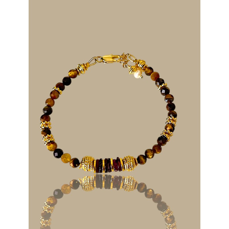 La ligne GUSTAVE se distingue par son allure affirmé et son élégance subtile. Monté sur des pierres fines facettées de 4mm, chaque bracelet s’articule autour d’une amulette centrale en gemmes heishi facettés, encadrée par deux grosses perles dorées à l’or fin 24 carats, qui dominent délicatement l’ensemble.