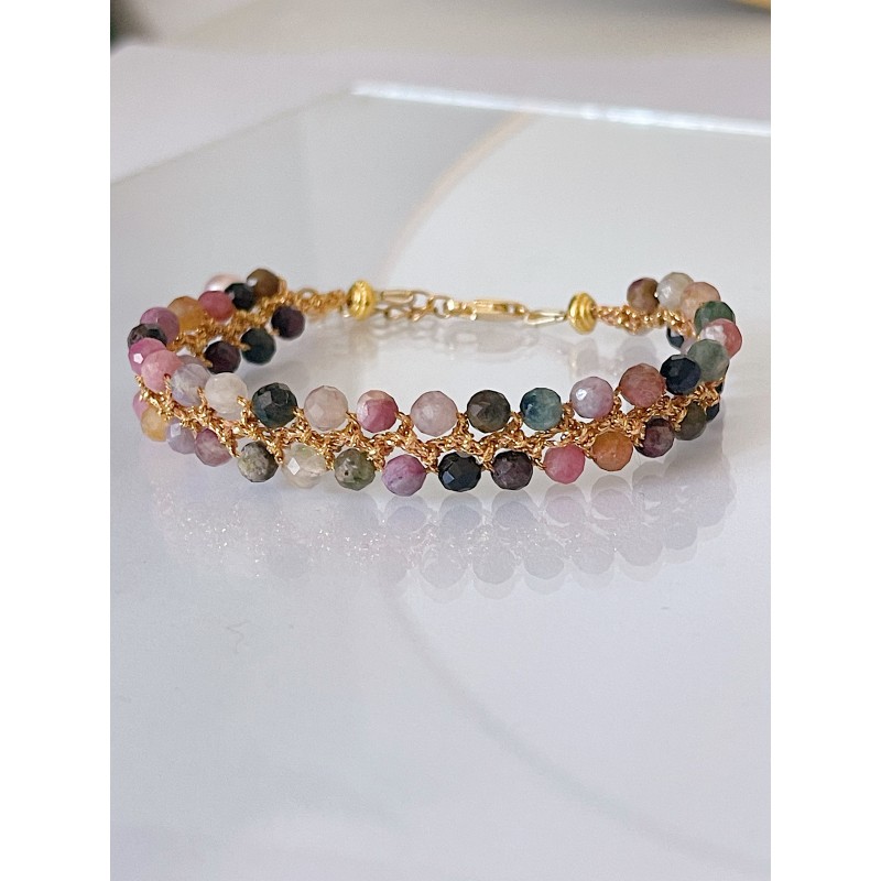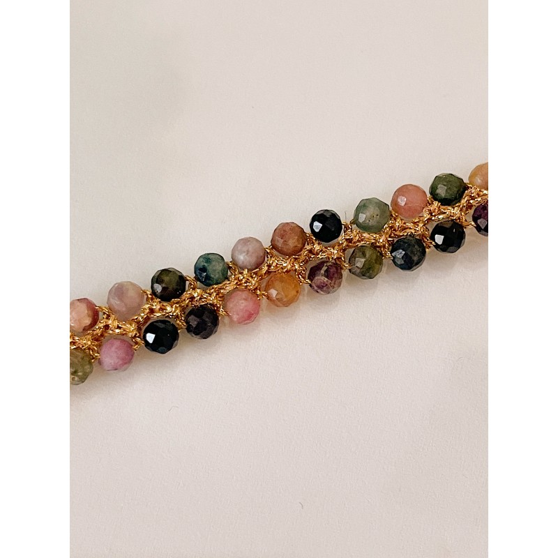 Chaque pièce est composée de cinquante pierres fines minutieusement facettées, choisies pour leur éclat et leur pureté. Le fil utilisé est un véritable bijou à lui seul : un fil japonais doré de haute couture, dont l’âme contient un fil d’argent, offrant au bracelet éclat, souplesse et raffinement.