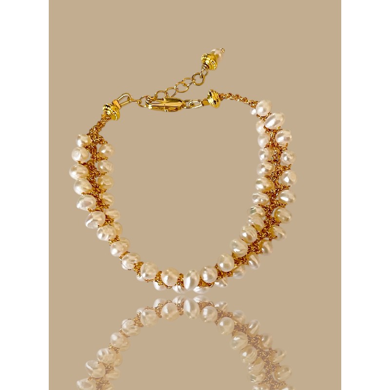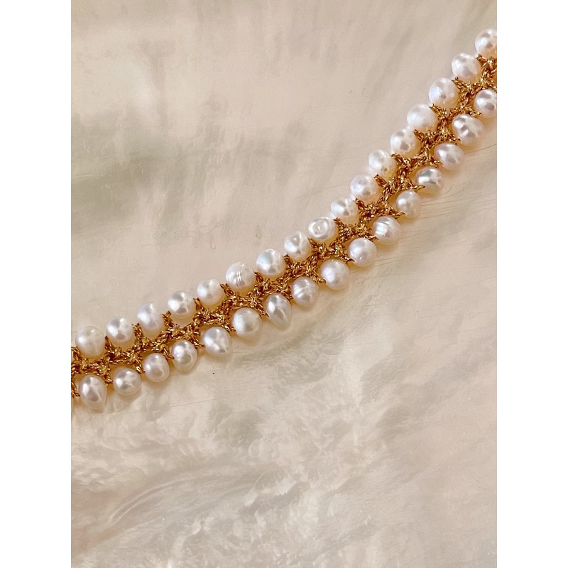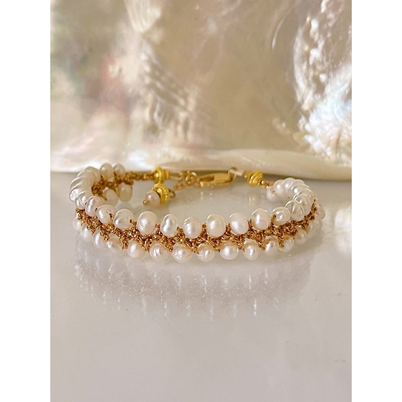 Chaque pièce est composée de cinquante perles de culture minutieusement choisies pour leur lustre blanc-crème. Le fil utilisé est un véritable bijou à lui seul : un fil japonais doré de haute couture, dont l’âme contient un fil d’argent, offrant au bracelet éclat, souplesse et raffinement.