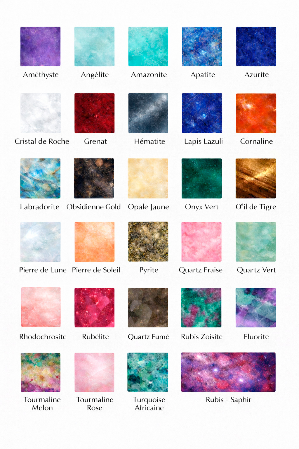 SANTÉ : Lapis-lazuli, malachite, aigue-marine, fluorite, tourmaline rose, quartz rose, cornaline, dumortiérite, améthyste, onyx, obsidienne gold, hématites, angélite, Iolite.