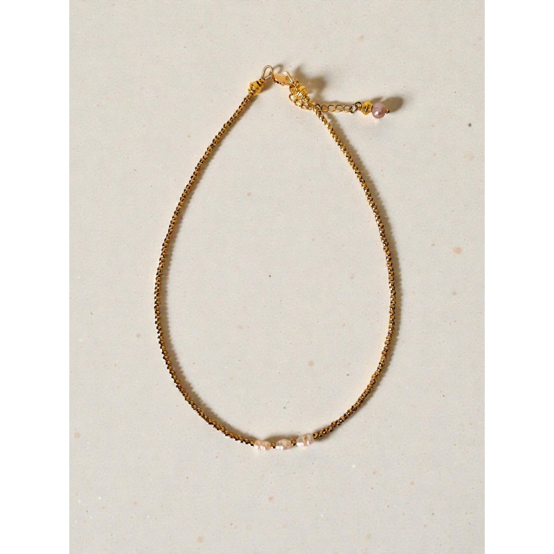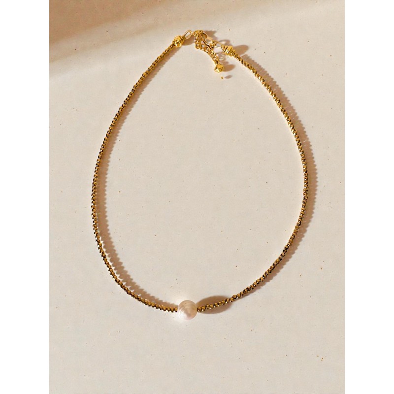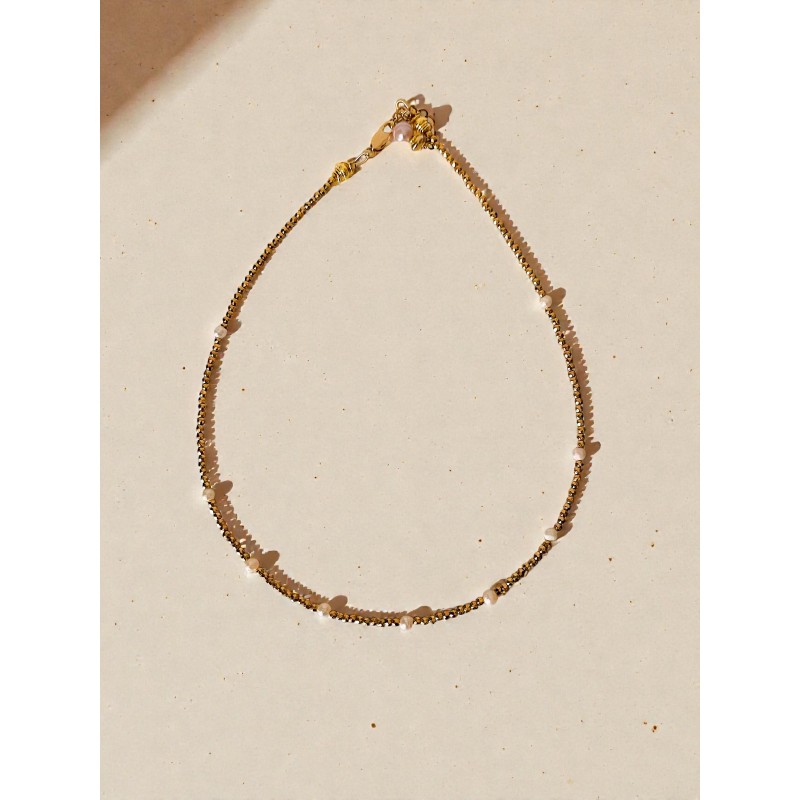 Collier choker en hématite facettée, à la finition gold vintage, révélant une lumière patinée aux accents dorés précieux.