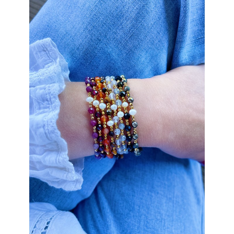 Chaque modèle est composé de pierres fines facettées de 4mm, mises en valeur par de discrètes hématites rondes facettées de 2mm, qui apportent éclat et luminosité.