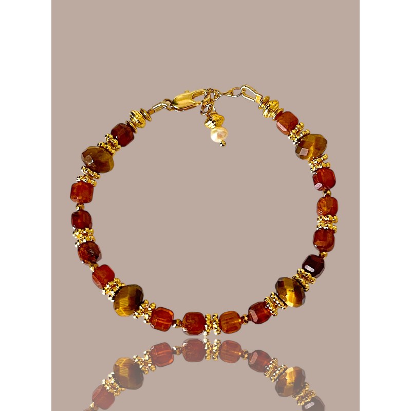 Bracelet LUCIAN, marie profondeur chaleureuse de l’héssonite facettée à l’éclat solaire de l’œil de tigre facetté. Ces pierres fines aux reflets chatoyants, sont mises en valeur par des hématites élégantes et des perles jintermédiaire délicatement doré à l’or fin 24 carats.