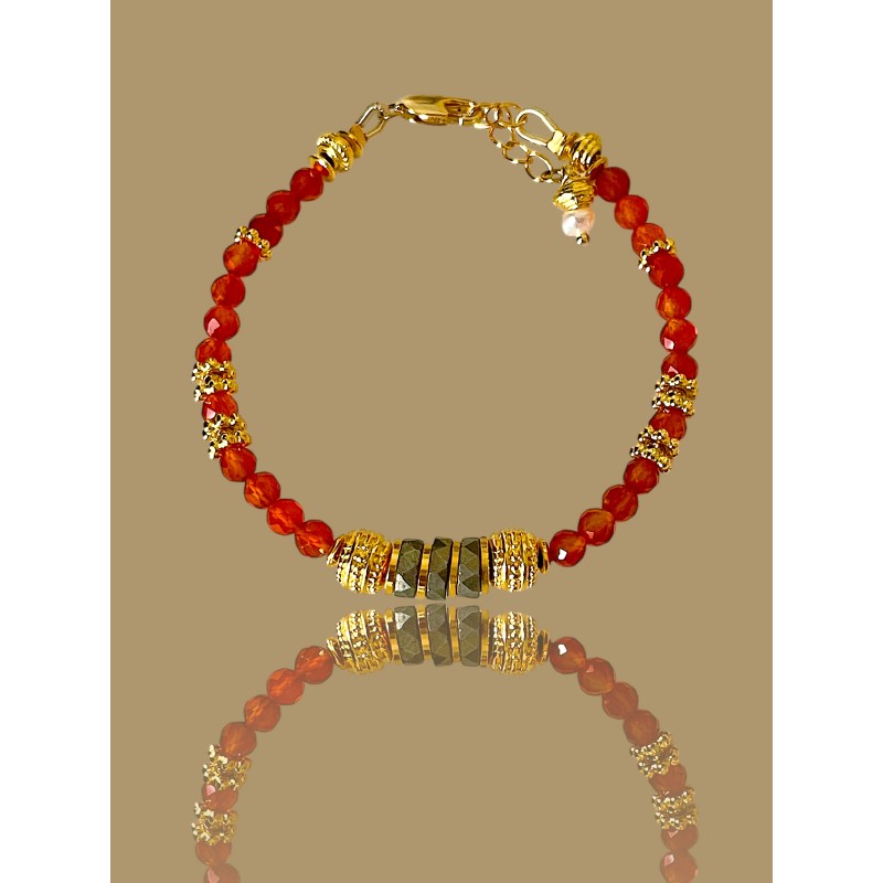 La ligne GUSTAVE se distingue par son allure affirmé et son élégance subtile. Monté sur des pierres fines facettées de 4mm, chaque bracelet s’articule autour d’une amulette centrale en gemmes heishi facettés, encadrée par deux grosses perles dorées à l’or fin 24 carats, qui dominent délicatement l’ensemble.