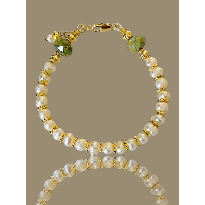 Isidore, caractère affirmé et subtile, le bracelet Isidore joue les contrastes avec les matières entre les pierres fines en ryolite et la perle de culture. Un jeu d’équilibre entre géométrie, texture et lumière, pensé pour révéler la beauté naturelle des gemmes et de la perle.