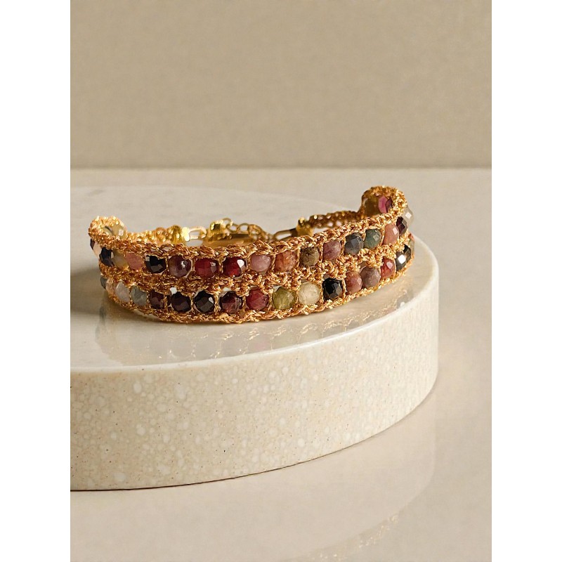 ÉLISE, est une manchette de cinquante pierres fines tissées à la main avec un fil japonais délicat, dans lequel se glisse un fil d'argent.