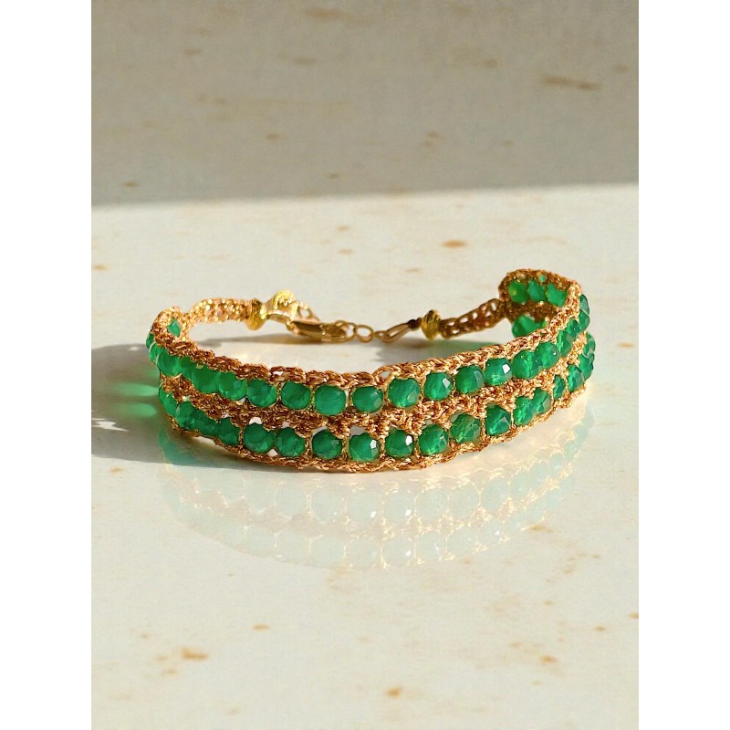 ÉLISE, est une manchette de cinquante pierres fines tissées à la main avec un fil japonais délicat, dans lequel se glisse un fil d'argent.