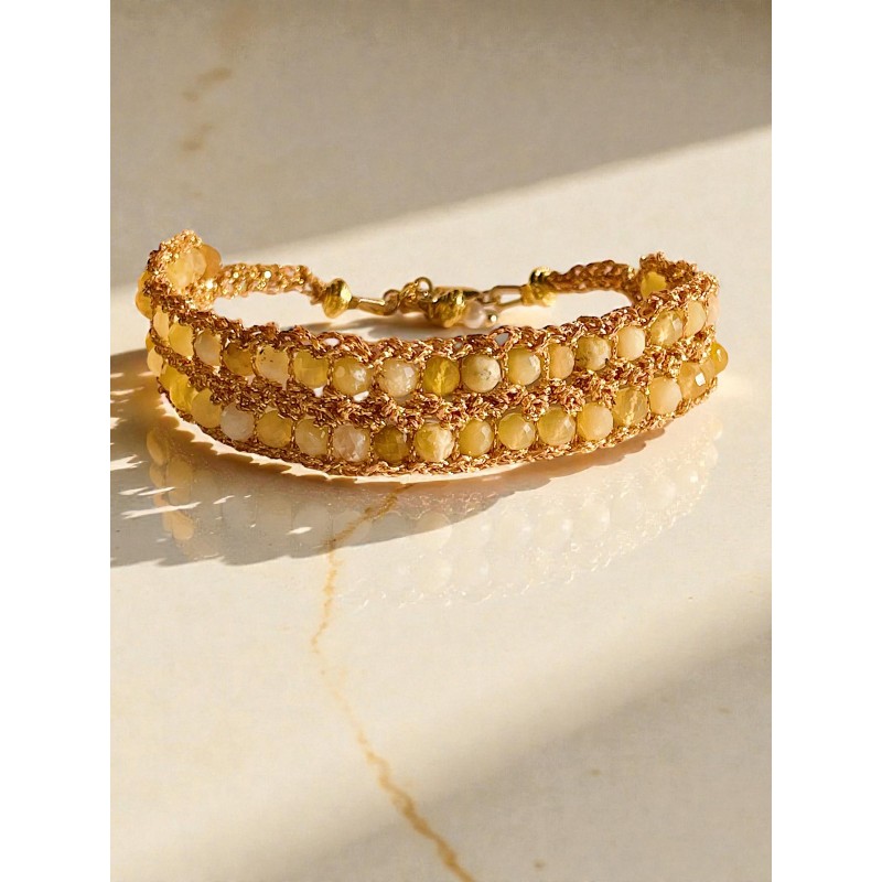 ÉLISE, est une manchette de cinquante pierres fines tissées à la main avec un fil japonais délicat, dans lequel se glisse un fil d'argent.