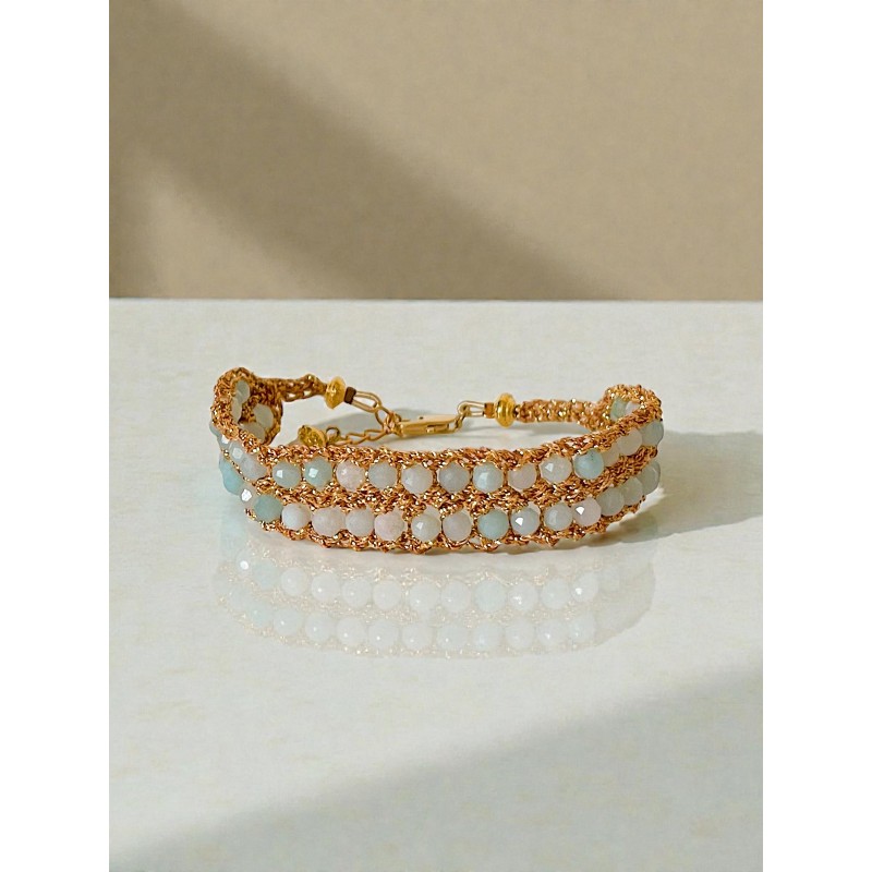 ÉLISE, est une manchette de cinquante pierres fines tissées à la main avec un fil japonais délicat, dans lequel se glisse un fil d'argent.