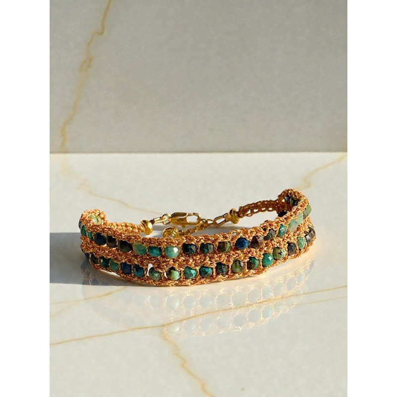 ÉLISE, est une manchette de cinquante pierres fines tissées à la main avec un fil japonais délicat, dans lequel se glisse un fil d'argent.