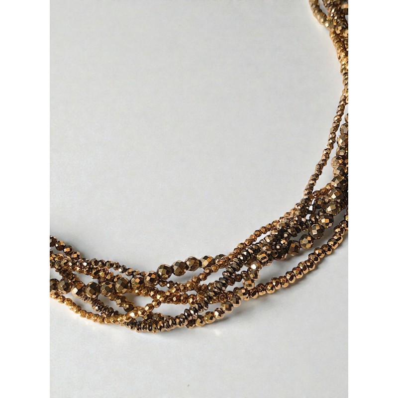 Un bijou solaire, précieux et lumineux. Le collier VÉNUS se compose de six fils d'hématite facettée, aux tailles délicatement graduées. Les nuances oscillent du gris pyrite profond à un doré vintage délicat, créant un jeu de lumière subtil et raffiné. Chaque reflet révèle une aura solaire, vibrante et magnétique