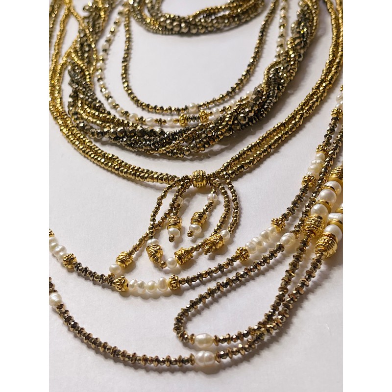 Harmonie parfaite entre rétro, sophistiqué et glamour contemporain. Le collier Guiseppina se compose de deux rangs d'hématite dorée gold vintage, et d'une cascade de 6 chainettes en hématites se terminant chacune par une perle de culture, formant un effet gros noeud élégant. Ce détail unique apporte un jeu de lumière et un mouvement fascinant à chaque geste.