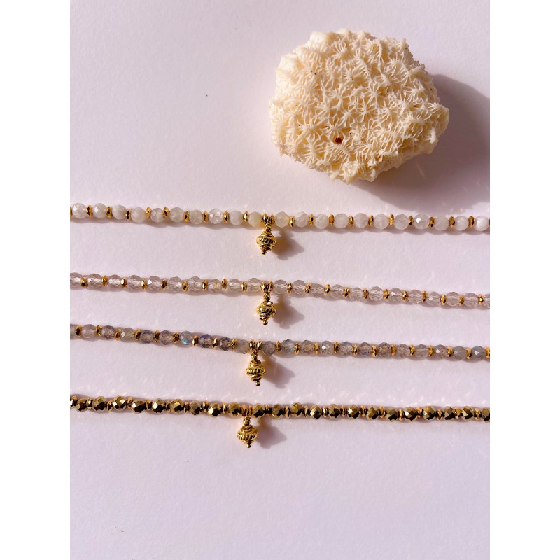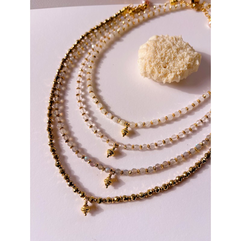 Au centre de ce collier, une petite toupie devient un soleil en mouvement. Autour d’elle, les pierres fines dansent comme les planètes autour d’un astre, chacune apportant énergie, lumière et équilibre.