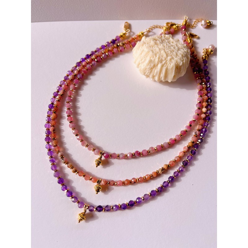 Au centre de ce collier, une petite toupie devient un soleil en mouvement. Autour d’elle, les pierres fines dansent comme les planètes autour d’un astre, chacune apportant énergie, lumière et équilibre.