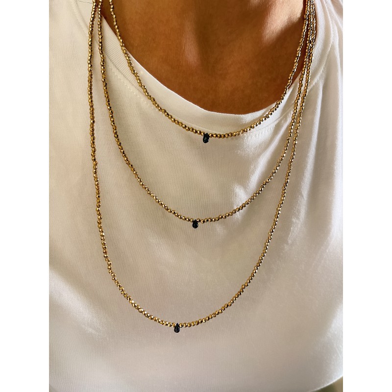 Le sautoir SONGE, cascade de 3 rangs en hématite dorée, ponctué en son coeur de trois saphirs bleus comme des éclats de nuit précieuse suspendus à la peau.