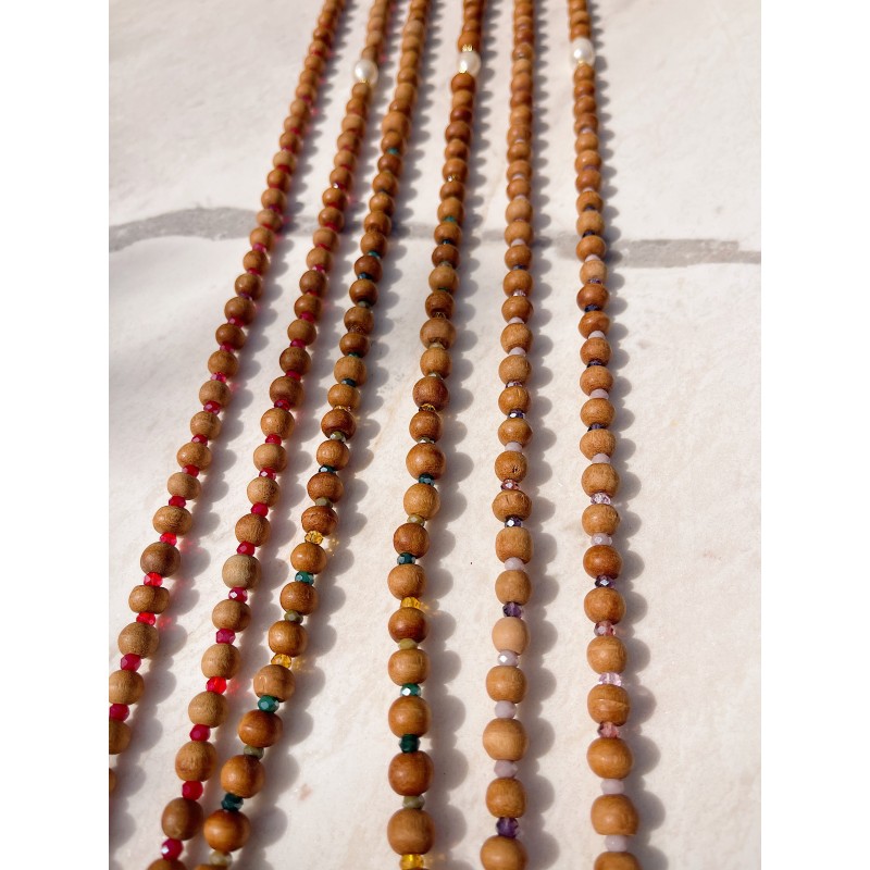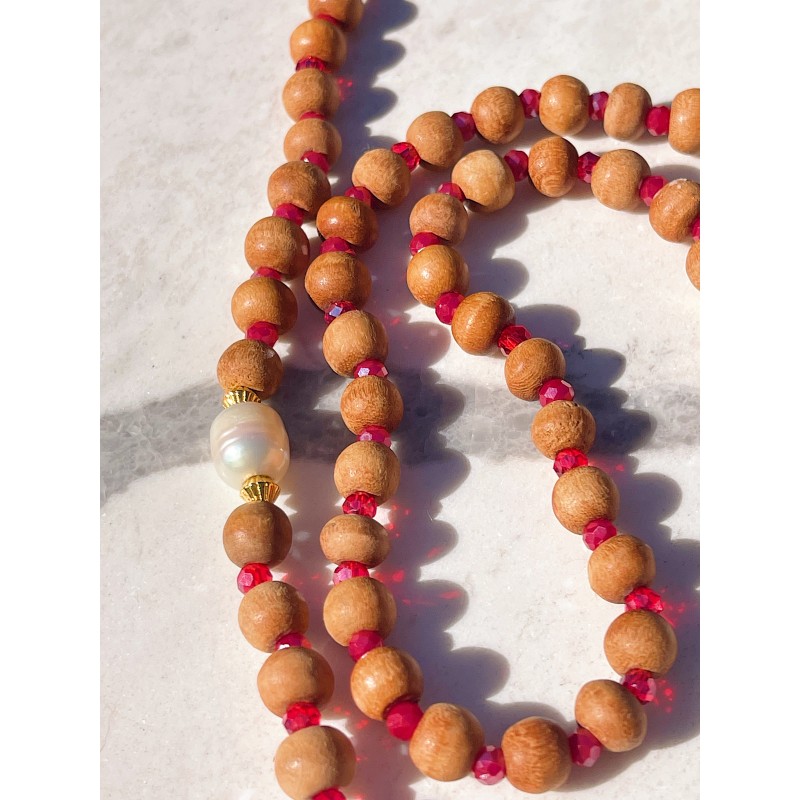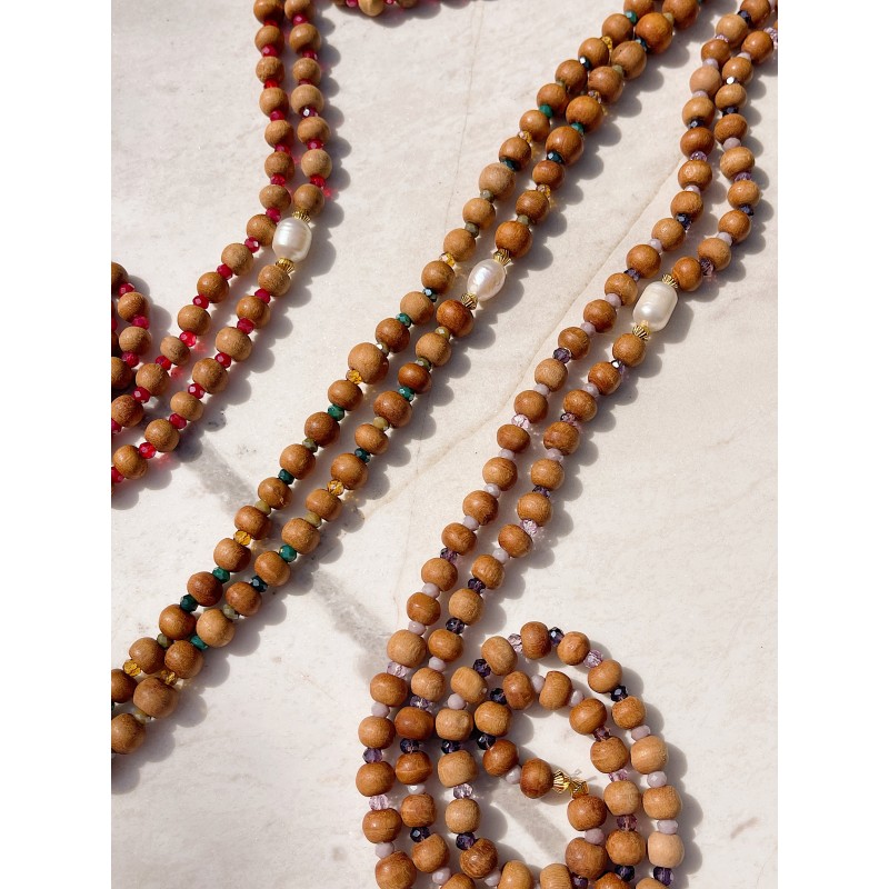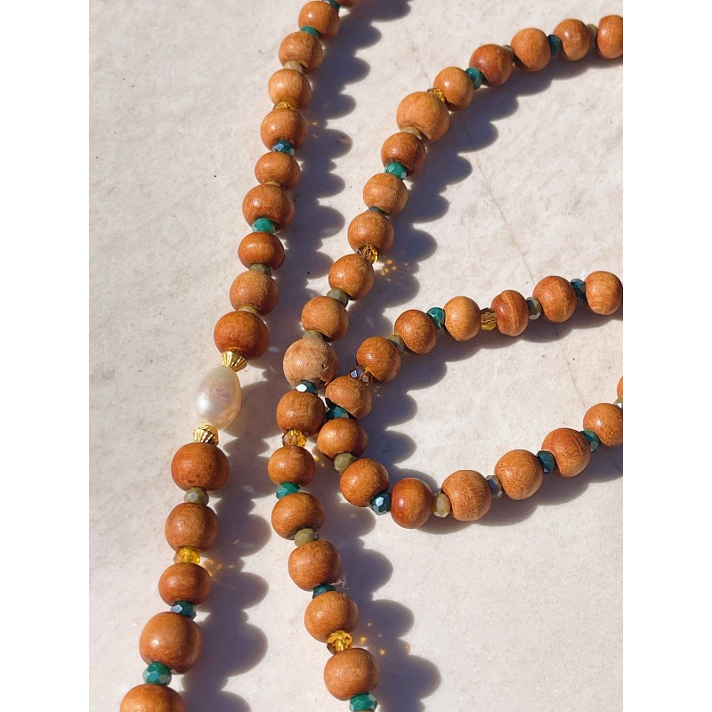 Perle de culture, bois de santal, perles en cristal.